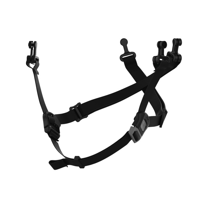En nylon et élastique. Réglable, adaptable sur les casques 19865. 2 points d'ancrage latéraux, fermeture et ouverture rapide par boucle.