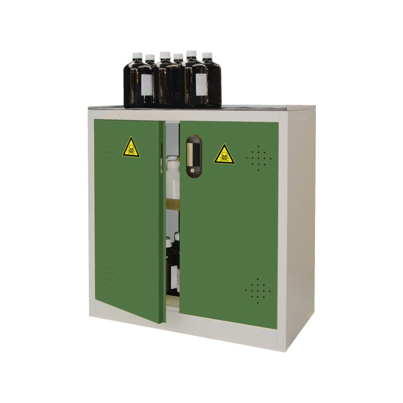 En acier monobloc avec portes battantes à 110°. Fournie avec pictogrammes normalisés. Orifices de ventilation. Fermeture à clé en 3 points. Étagères et bacs de rétention réglables en hauteur sur crémaillères, au pas de 15 mm. Armoire haute à 4 étagères ou basse à 2 étagères. Plan de travail des armoires comptoirs recouvert par un tapis en caoutchouc. Conforme aux articles R5132-66 et R5132-68 du Code de la Santé Publique. Conforme aux recommandations de l'INRS. Charge admissible par étagère : 80 kg UR Coloris : corps gris et portes jaunes Existe avec portes rouges, bleues ou vertes, nous consulter.
