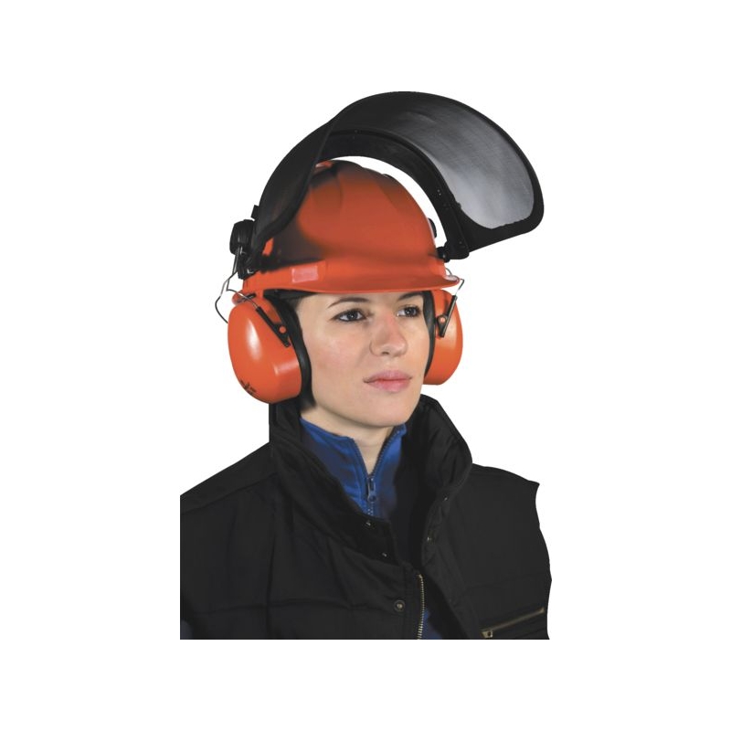 Protection de la tête forestier composée de : - casque Calotte en ABS, 4 points de fixation, coiffe textile, tour de tête en plastique équipé d'un serre-nuque à crémaillère permettant un réglage facile, mousse de confort à l'arrière, bandeau antitranspiration. Coloris : orange Norme : CE Cat II - EN 397 - coquilles antibruit adaptables par encliquetage SNR 25,9 dB. Coloris : orange Norme : CE Cat III - EN 352-3 - porte-visière et visière grillagée. Norme : CE Cat II - EN 1731 Poids : 779 g