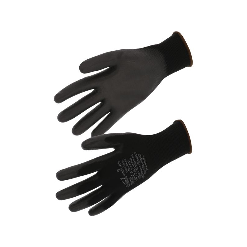 Enduction polyuréthane sur paume et bouts de doigts. Support tricoté en polyamide, sans couture, jauge 13. Dos aéré, poignet élastique. Manipulation légère / Milieu sec Applications métiers : mécanique de précision, manipulation fine en milieu sec, assemblage de petites pièces, industrie électronique Coloris : noir Taille : 7 à 11 Norme : CE Cat II - EN 388 (3121X)
