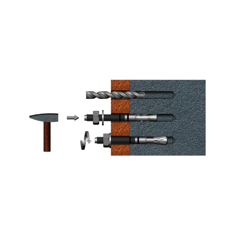 Avec écrou et rondelle prémontés en acier zingué. Utilisation dans béton non fissuré résistant à la compression. Pour fixer garde-corps, consoles, sabots, solives. Agrément : ATE 08/0339 option 7