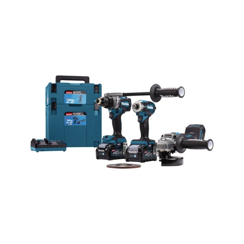 Fonctionne sur batterie 40 V. Perceuse-visseuse XGT DF001G Couple : 150 Nm Vitesse : 650-2600 tr/mn Poids : 2,300 kg Meuleuse GA005G Pour disque Ø 125 mm. Vitesse : 8500 tr/mn Poids : 2,600 kg Visseuse à chocs XGT TD001G Couple : 220 Nm Vitesse : 3200-3700 tr/mn Cadence de frappe : 3600 cps/mn Poids : 2 kg Livré en coffret Mac-Pak 4 et coffret Mac-Pak 2, avec chargeur DC40RA et 2 batteries 40 V max XGT.