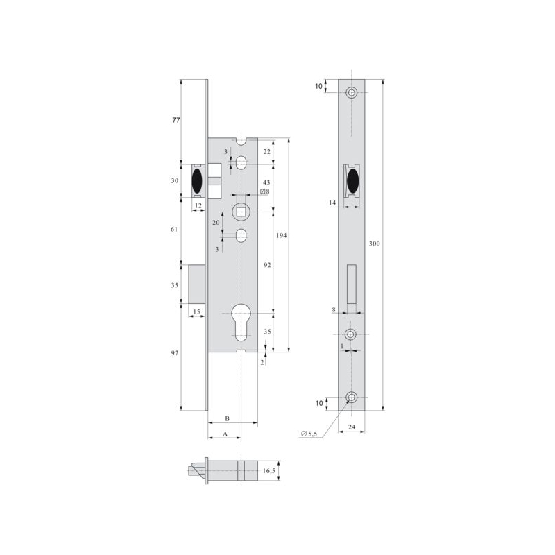 Coffre en acier zingué. Têtière plate en inox 304 L. Condamnation à 1 tour de clé. ½ tour réversible sans démontage. Rappel du pêne ½ tour à la clé. Gâche à commander séparément. Dimensions coffre : 194 x 16.5 mm Saillie du pêne ½ tour : 12 mm Saillie du pêne dormant : 15 mm Entraxe : 92 mm Fouillot carré : 8 mm Têtière : 244 x 22 mm Entraxe de perçage : 220 mm Conditionnement : boite 100% recyclable.